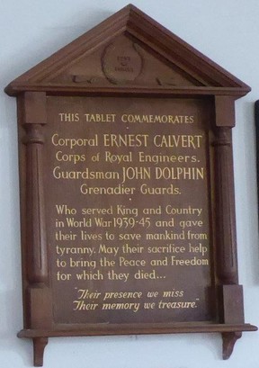 THIS TABLET COMMEMORATES/ CORPORAL ERNEST CALVERT/ CORPS OF ENGINEERS/ GUARDSMAN JOHN DOLPHIN/ GRENADIER GUARDS/ WHO SERVED KING AND COUNTRY/ IN WORLD WAR 1939-1945 AND GAVE/ THEIR LIVES TO SAVE MANKIND FROM/ TYRANNY. MAY THEIR SACRIFICE HELP/ TO BRING THE PEACE AND FREEDOM/ FOR WHICH THEY DIED.../ "THEIR PRESENCE WE MISS/ THEIR MEMORY WE TRESURE"