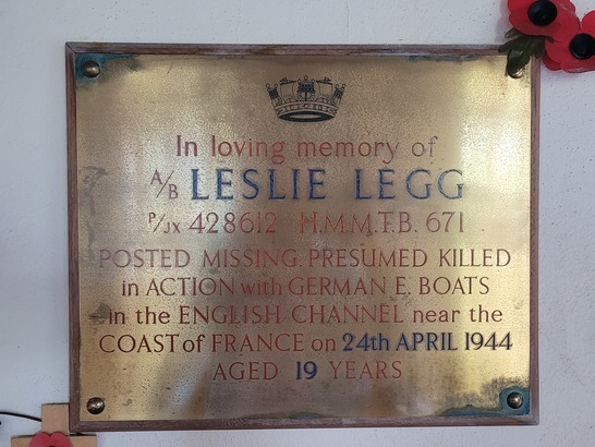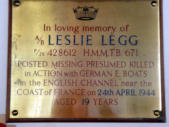 'In loving memory of / A.B. LESLIE LEGG / PJX 428612 H.M.M. T.B. 671 / POSTED MISSING PRESUMED KILLED / in ACTION with GERMAN E. BOATS / in the ENGLISH CHANNEL near the / COAST of FRANCE in 24th APRIL 1944 / AGED 19 YEARS'