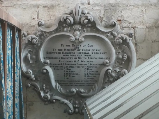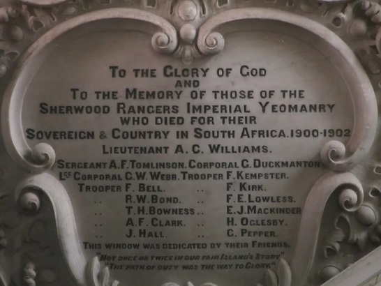 To the Glory of God and to the memory of those of the Sherwood Rangers Imperial Yeomanry wod died for their Sovereign and Country in South Africa 1900-1902. Lieutenant A. C. Williams, Sergeant A. F. Tomlinson, Corporal G. Duckmanton, Lance Corporal G. W. Webb, Trooper F. Bell, Trooper R. W. Bond, Trooper T. H. Bowness, Trooper A. F. Clark, Trooper J. Hall, Trooper F. Kempster, Trooper F. Kirk, Trooper F. E. Lowless, Trooper E. J. Mackinder, Trooper H. Oglesby, Trooper G. Pepper. This window was dedicated by their friends.