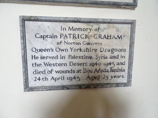 In memory of/Captain Patrick Graham/of Norton Conyers/Queen's Own Yorkshire Dragoons/He served in Palestine, Syria, and in/the Western Desert 1940-1943 and/died of wounds at Bou Arada, Tunisia/24th April 1943 aged 25 years.