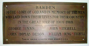 BARDEN/TO THE GLORY OF GOD AND IN MEMORY OF THE MEN/WHO LAID DOWN THEIR LIVES FOR THEIR COUNTRY/IN THE GREAT WAR OF 1914 - 1918/ (NAMES)/THEIR NAME LIVETH FOR EVERMORE/ECCLUS XLIV.IX