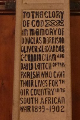 To the glory of God and in memory of/ Douglas Morrison/ Oliver Alexander C. Cunningham and/ David Leitch of this parish who gave / their lives for their Country in the South African War 1899-1902