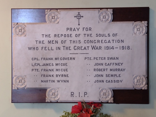 +/PRAY FOR/THE REPOSE OF THE SOULS OF/THE MEN OF THIS CONGREGATION/WHO FELL IN THE GREAT WAR 1914-1918/_____/[10 names]//R.I.P.
