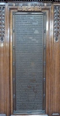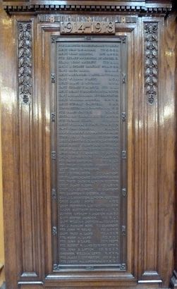 At the top of the memorial-TO THE MEMORY/OF/THE FORMER PUPILS OF THIS SCHOOL/WHO FELL/IN THE TWO GREAT WARS 1914-1918 & 1939-1945 ; Carved in relief in wood above each WW1 Plaque 1914-1918