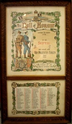 YORKSHIRE AMATEUR/ SWIMMING ASSOCIATION/ THIS ROLL OF HONOUR/ CONTAINS THE NAMES/ OF THE/ MEMBERS/ OF THE/ SKIPTON/ SWIMMING CLUB/ WHO SERVED WITH/ HIS MAJESTY'S FORCES/ 1914/ 1915/ IN THE FULNESS OF LIFE/ THEY SHRANK NOT FROM DEATH/ (103 names)