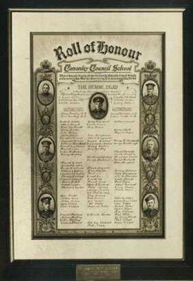 THE WAR MEMORIAL OF THE GREAT WAR 1914 - 1919, THE GIFT OF TEACHERS AND OLD SCHOLARS OF THE CONONLEY NATIONAL AND COUNCIL SCHOOLS WAS UNVEILED ON SATURDAY APRIL 24TH 1920, BY JOSEPH HUDSON FORMERLY COPORAL IN THE 6TH DUKE OF WELLINGTONS, WR, REGIMENT, AND THE FIRST VOLUNTEER FROM THE VILLAGE - SEPTEMBER 24TH 1914