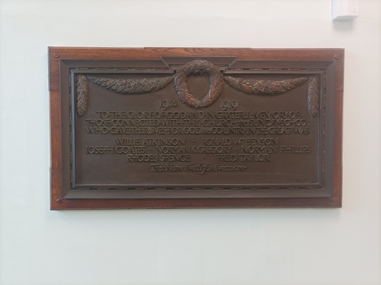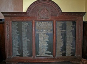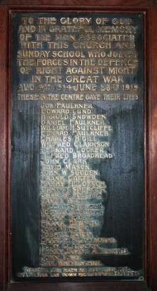 Central Panel-TO THE GLORY OF GOD/AND IN GRATEFUL MEMORY/OF THE MEN ASSOCIATED/WITH THIS CHURCH AND/SUNDAY SCHOOL WHO JOINED/THE FORCES IN THE DEFENCE/OF JUST AGAINST MIGHT/IN THE GREAT WAR/AUG 4TH 1914-JUNE 28TH 1919/THESE IN THE CENTRE GAVE THEIR LIVES/"GREATER LOVE HATH NO MAN THAN THIS,/THAT A MAN LAY DOWN HIS LIFE FOR HIS FRIENDS"