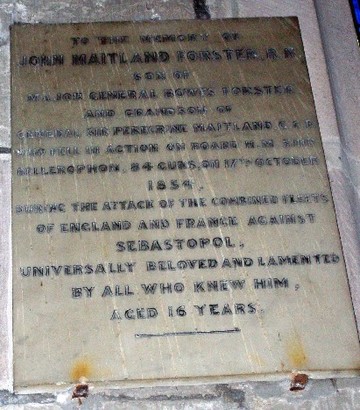 In Memory of John Maitland Forster son of Major-General Bowes Forster and grandson of General Sir Peregrine Maitland who fell in action on board H.M. ship Bellerophon, 84 guns on 17th October 1854, during an attack of the combined fleets of England and France against Sebastopol. Universally beloved and lamented by all who knew him age 16 years'