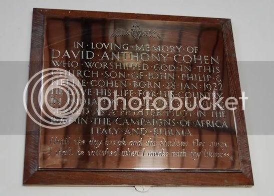 IN LOVING MEMORY OF/DAVID ANTHONY COHEN/WHO WORSHIPPED GOD IN THIS/CHURCH SON OF JOHN PHILIP &/NELLIE COHEN BORN 28 JAN 1922/HE GAVE HIS LIFE FOR HIS COUNTRY/IN INDIA ON 4 AUG 1945 HAVING/SERVED AS A FIGHTER PILOT IN THE/R.A.F. IN THE CAMPAIGNS OF AFRICA/ITALY AND BURMA/Until the day break and the shadows flee away/I shall be satisfied when I awake with thy likeness