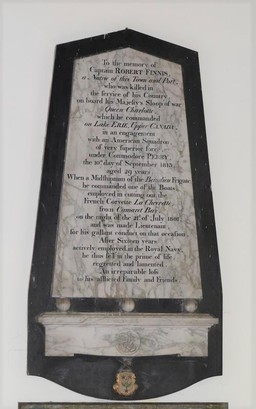 'To the memory of / Captain ROBERT FINNIS / A Native of this Town and Port / who was killed in /the service of his Country / on board his Majesty's Sloop of War / Queen Charlotte / which he commanded / on Lake Erie, upper CANADA / in an engagement / with an American Squadron / of very superior force / under Commodore PERRY / the 10th day of September 1813 / aged 29 years./ When a Midshipamn of the Beaulieu frigate / he commanded one of the Boats / employed in cutting out the / French corvette La Chevrette / from Cameret Bay / on the night of the 21st of July 1801 / and was made Lieutenant / for his gallant conduct on that occasion. / After Sixteen years / actively employed in the Royal Navy / he thus fell in the prime of life / regretted and lamented / an irreparable loss / to his afflicted Family and Friends'