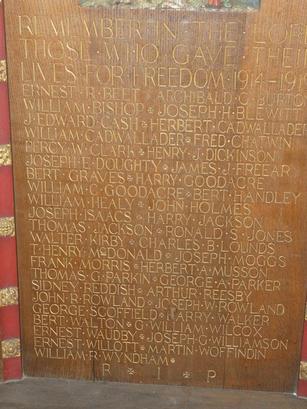 Ernest R. Beet, William Bishop, Joseph H. Blewitt, Archibald G. Burton, Herbert Cadwallader, J. Edward Cash, Fred Chatwin, Percy W. Clark, Henry J. Dickinson, Joseph F. Doughty, James J. Freear, William C, Goodacre. Harry Goodacre, Bert Graves, Bert Handley, John Holmes, William Healey, Joseph Isaacs, Harry Jackson, Thomas Jackson, Ronald S. Jones, Walter Kirby, Charles B. Lounds, T. Henry Macdonald, Joseph Moggs, Frank Morris, Herbert A. Musson, George A. Parker, Thomas G. Parkin, Sidney Reddish, Arthur Reesby, Joseph W. Rowland, John R. Rowland, George Scoffield, Harry Walker, Bert Walton, Ernest Waudby, G. William Wilcox, Joseph G. Williamson, Ernest Willmott, Martin Woffindin, William R, Wyndham, R.I.P.