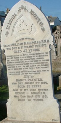 'In Loving Memory of / MY DEAR HUSBAND / SEAMAN WILLIAM B. NICHOLLS; R.N.R., / WHO DIED AT ST IVES, MAY 20TH 1913 / AGED 47 YEARS / HAVING BEEN IN THE ROYAL NAVAL RESERVE FOR / OVER 25 YEARS HE RESPONDED TO HIS COUNTY'S / CALL WHEN THE WAR DRUMS WERE SOUNDED. / HE WAS ON BOARD H.M.S 'HIGHFLYER' WHEN THE GERMAN AUXILLIARY CRUISER 'KAISER WILHELM DER GROSSE' / WAS SUNK IN 1914. HE WAS ALSO IN THE JUTLAND / BATTLE BEING ONE OF THE CREW OF H.M.S. 'VALIANT' / GREATER LOVE HATH NO MAN THAN THIS, THAT HE / LAY DOWN HIS LIFE FOR HIS FRIENDS / ALSO OF / NANCY PAYNTER/WHO DIED AUGUST 11TH 1936/AGED 85 YEARS / ALSO OF MY DEAR MOTHER / BESSIE C. NICHOLLS, / WHO DIED DECR. 15TH 1951, / AGED 78 YEARS.'