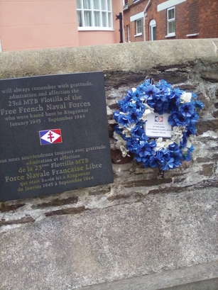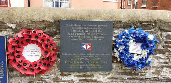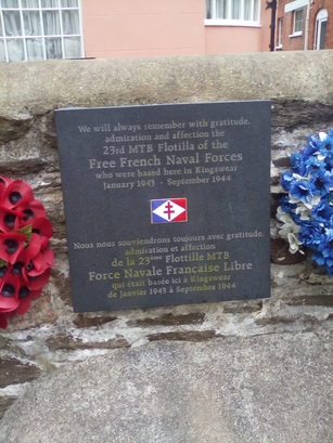 We will always remember with gratitude/admiration and affection the/23rd MTB Flotilla of the/Free French Naval Forces/who were based here in Kingswear/January 1943-September 1944/[the same dedication is repeated in French]
