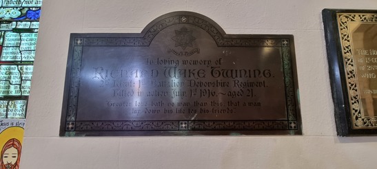 In loving memory of/ Richard Wake Twining/ 2nd Lieut. 1st Battalion, Devonshire Regiment/ Killed in action July 1st 1916, aged 21/ Greater love hath no man than this that he may/ lay down his life for his friends.