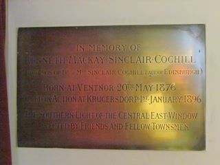 IN MEMORY OF/KENNETH MACKAY SINCLAIR COGHILL/THIRD SON OF DR. AND MRS. SINCLAIR COGHILL (LATE OF EDINBURGH)/BORN AT VENTNOR 20TH MAY 1876/KILLED IN ACTION AT KRUGERSDORP, 1ST JANUARY 1896/THE SOUTHERN LIGHT OF THE CENTRAL EAST WINDOW/ERECTED BY FRIENDS AND FELLOW TOWNSMEN