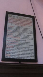 THIS IS TO RECORD/ that the following Gifts have been made to this Church/ to the Glory of God for the adornment of His House &/ in pious memory of some of His servants & handmaids/ who have gone before us with the Sign of Faith & now/ rest in the Sleep of Peace/ THE ALTARS/ The High Altar In memory of the four Sons of Richard Ussher first Priest of this Church/ Robert Arland Ussher, Secret Service, Died at Oxford † Beverly Ussher, Capt. Leinster Regiment Killed at Gallipoli † Stephen Ussher, Capt. 129th Baluchis, Killed at Givenchy † Richard Ussher Lt. Com. R.N. D.S.O. died at Ventnor † during the Great War 1914-1918. Subscribed for by their friends. The Reredos In Memory of A.F. Reginald Clarke Croix de Guerre Belge, Staff Sergt. RAMC died from disease contracted in the war 16. VII. 1919 † Given by his parents. The Crucifix In Memory of C. Harry Hunt Castle, Capt. Gloster Regt, died of wounds 30.X.18 † Given by his brother Graham H. Castle M.A. Priest of this Church 1921-1925. The Candlesticks In memory of Mary Lucy Jolliffe, died 24.VI.06 † Given by her daughter Innell Jolliffe. The Altar of Our Lady & its Reredos In memory of Mary Fraser. Given by her husband Edward Fraser. OTHER ORNAMENTS The 5th Station of the Cross In memory of William Kemp, successively Server, Sacristan and Churchwarden of this Church, died 1.VIII.25 † Given by his friends at S. Albans. The 6th Station of the Cross In memory of Charles Albert Harber,[1] Verger of this Church 1885-1922 died 16.II.22 † Given by his friends at S. Albans. The Warning Bell In memory of Colin Bartlett, died 8.X.22 † Given by his widow. The Memorial For those who fell in the 1914-1918 War was given by Major & Mrs Raeburn in memory of their son James Wyllie Raeburn, Killed † 24.VIII.18 The Plaque On the Lady Altar was given by the Parishioners and dedicated by the Right Rev A.B.L. Karney on 21.4.48 in memory of those who fell in the 1939-45 War Norman G Bridges; Robin Kemp; Jack Tarrant; Henry Underwood; Charles H Waller; Jeffrey Webber. The Canopy over the statue of Our Lady was given my Mrs A V Saunders in memory of her relations Mary S Deighton died 12.XII.09 † Henry Deighton died 28.I.22 † William Augustus Deighton died 9.XI.37 † Ann Jane Deighton died [.. .. ..] †