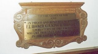 TO THE GLORY OF GOD/ THIS WINDOW IS DEDICATED AS/ A TOKEN OF HONOUR IN THANKFUL/ REMEMBRANCE OF WORSHIPPERS/ WHO FROM THIS CHURCH SERVED/ AND SACRIFICED THEIR LIVES/ IN THE GREAT WAR 1914 - 1918