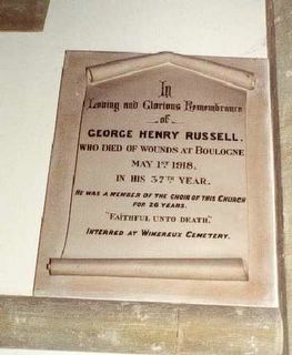 In/ Loving and Glorious Remembrance/ of/ GEORGE HENRY RUSSELL/ MAY 1ST 1918/ IN HIS 37TH YEAR// HE WAS A MEMBER OF THE CHOIR OF THIS CHURCH/ FOR 26 YEARS// "FAITHFUL UNTO DEATH"// INTERRED AT WIMEREUX CEMETERY