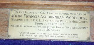 TO THE GLORY OF GOD AND IN LOVING MEMORY OF/ JOHN FRANCIS ASHBURNHAM WODEHOUSE/ (SECOND LIEUT. D.C.L.I.) ATTACHED ROYAL FLYING CORPS/ BORN JUNE 17TH 1897/ KILLED IN ACTION IN FRANCE IN THE GREAT WAR AUG 26TH 1917/ AGED 20 YEARS/ "GREATER LOVE HATH NO MAN THAN THIS, THAT A MAN/ LAY DOWN HIS LIFE FOR HIS FRIENDS" JOHN XV.1