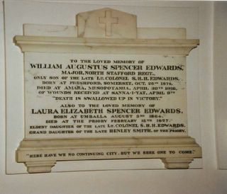TO THE LOVED MEMORY OF/ WILLIAM AUGUSTUS SPENCER EDWARDS/ MAJOR NORTH STAFFORD REGT/ ONLY SON OF THE LATE LT COLONEL S H H EDWARDS/ BORN AT FRESHFORD SOMERSET, OCT 26TH 1874/ DIED AT AMARA MESOPOTAMIA, APRIL 30TH 1916/ OF WOUNDS RECEIVED AT SANNA-I-YAT, APRIL 9TH/ "DEATH IS SWALLOWED UP IN VICTORY"