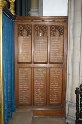 Centre Panel-IN/ LOVING AND THANKFUL/ MEMORY OF/ THE MEN OF/ THIS CONGREGATION/ AND RELATIVES OF/ WORSHIPPERS IN THIS/ CHURCH WHO LAID DOWN/ THEIR LIVES/ IN THE GREAT WAR/ 1914 - 1918/ "WHOSO LOSETH HIS LIFE FOR/ MY SAKE SHALL FIND IT."
