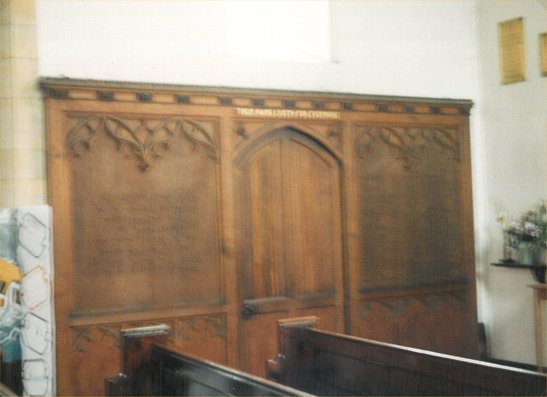 TO THE GLORY OF GOD/ AND IN HONOURED MEMORY OF/ THOSE FROM THIS PARISH/ WHO LAID DOWN THEIR LIVES/ FOR THEIR COUNTRY IN THE/ GREAT WAR 1914 - 1919, THE/ ADJOINING VESTRY WAS ERECTED/ BY THEIR FELLOW PARISHIONERS