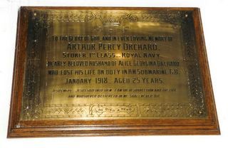 TO THE GLORY OF GOD, AND IN LOVING MEMORY OF/ ARTHUR PERCY ORCHARD/ STOKER 1ST CLASS, ROYAL NAVY/ DEARLY BELOVED HUSBAND OF ALICE GEORGINA ORCHARD/ WHO LOST HIS LIFE ON DUTY IN H.M. SUBMARINE G8/ JANUARY 1918, AGED 25 YEARS/ JESUS WEPT, JESUS SAID UNTO THEM, I AM THE RESURRECTION AND THE LIFE/ AND WHOSOEVER BELIEVETH IN ME SHALL NEVER DIE/ HE DIED A HERO
