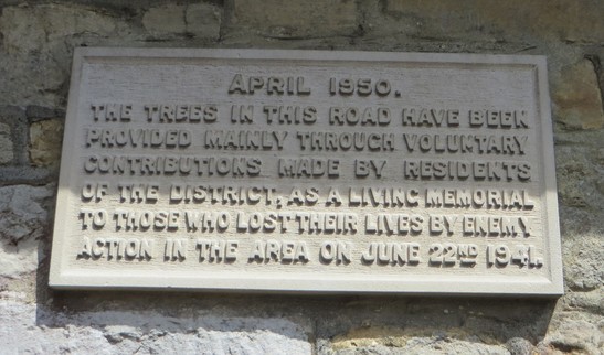 APRIL 1950/ THE TREES IN THIS ROAD HAVE BEEN/ PROVIDED MAINLY THROUGH VOLUNTARY/ CONTRIBUTIONS MADE BY RESIDENTS/ OF THE DISTRICT, AS A LIVING MEMORIAL/ TO THOSE WHO LOST THEIR LIVES BY ENEMY/ ACTION IN THIS AREA ON JUNE 22ND 1941