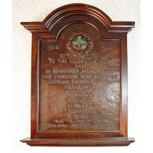 IRVINE POST OFFICE/ 1914 1918/ TO THE GLORY OF GOD/ AND/ IN HONOURED MEMORY OF/ OUR COMRADES WHO MADE THE/ SUPREME SACRIFICE IN THE/ GREAT WAR/ (5 Names)/ "THEIR NAME LIVETH FOR EVERMORE"