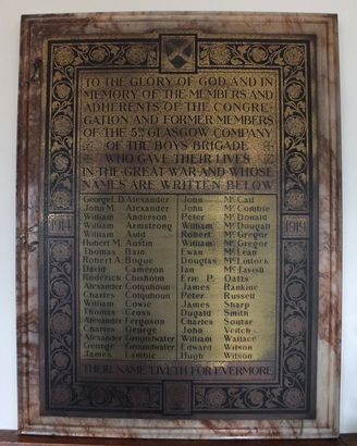 TO THE GLORY OF GOD AND IN/ MEMORY OF THE MEMBERS AND/ ADHERENTS OF THE CONGREGATION/ AND FORMER MEMBERS OF THE/ 5TH GLASGOW COMPANY OF THE BOYS BRIGADE WHO GAVE THEIR/ LIVES IN THE GREAT WAR AND/ WHOSE NAMES ARE WRITTEN BELOW/ (38 names in 2 columns)/ THEIR NAME LIVETH FOR EVERMORE