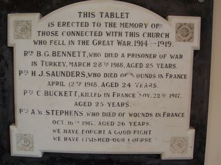 Tablet- THIS TABLET/ IS ERECTED TO THE MEMORY OF/ THOSE CONNECTED WITH THIS CHURCH/ WHO FELL IN THE GREAT WAR 1914 - 1919/ ---- RFN. B.G. BENNETT, WHO DIED A PRISONER OF WAR/ IN TURKEY, MARCH 28TH, AGED 25 YEARS/ PTE. H.J. SAUNDERS, WHO DIED OF WOUNDS IN FRANCE/ APRIL 12TH 1918, AGED 24 YEARS/ PTE. C. BUCKETT, KILLED IN FRANCE NOV 22ND 1917,/ AGED 25 YEARS/ PTE. A.W. STEPHENS, WHO DIED OF WOUNDS IN FRANCE/ OCT 16TH 1917, AGED 26 YEARS/ "WE HAVE FOUGHT A GOOD FIGHT,/ WE HAVE FINISHED OUR COURSE"/ Relocation Plaque-DECEMBER 1994/ THIS MEMORIAL WAS/ REMOVED FROM THE/ METHODIST CHURCH/ NEW ROAD/ PORCHFIELD/ WHEN IT CLOSED IN/ 1991
