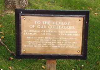 TO THE MEMORY/OF OUR COLLEAGUES/[6 names in 3 columns]/ WHO LAID DOWN THEIR LIVES FOR OUR COUNTRY/ IN THE WORLD WAR 1939 - 1945/ THESE RHODODENDRONS AND TREE WERE PLANTED/ BY THE EMPLOYEES OF THE CORPORATION OF/ NEWPORT, ISLE OF WIGHT, AND NEWPORT GAS UNDERTAKING