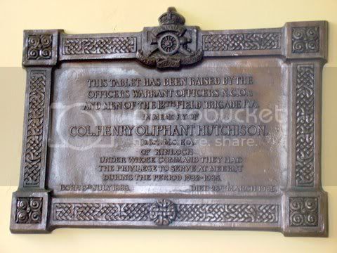 THIS TABLET HAS BEEN ERECTED BY/OFFICERS WARRANT OFFICERS N.C.O.'S/AND MEN OF THE 12TH FIELD BRIGADE R.A./IN MEMORY OF/COL. HENRY OLIPHANT HUTCHISON/D.S.O. M.C. R.A./OF KINLOCH/UNDER WHOSE COMMAND THEY HAD/THE PRIVILEGE TO SERVE AT MEERUT/DURING THE PERIOD 1932-1935/BORN 3RD JULY 1883-DIED 28TH MARCH 1935