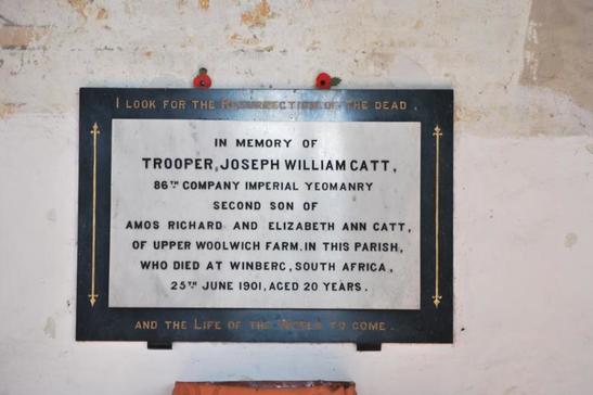 In memory of Trooper Joseph William Catt, 86th Company Imperial Yeomanry, second son of Amos Richard and Elizabeth Ann Catt, of Upper Woolwich Farm in this parish, who died at Winburg, South Africa 25th June 1901 aged 20 years.