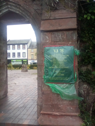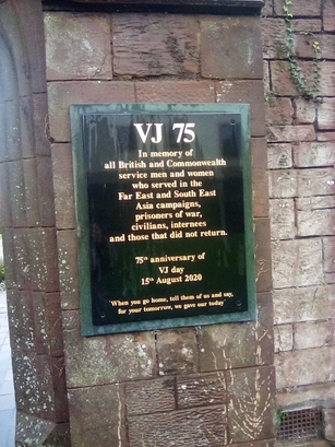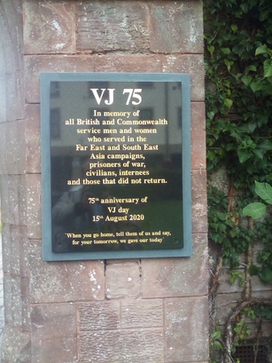 VJ75/In Memory of all British and/Commonwealth service men and women/who served in the Far East and South East/Asia campaigns,/Prisoners of war,/Civilians, internees/and those whp did not return/This memorial was dedicated on the 75th anniversary of/VJ Day/15th August 2020/"When You Go Home, Tell Them of Us and Say,/For Your Tomorrow, We Gave Our Today'
