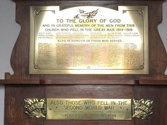 TO THE GLORY OF GOD/AND IN GRATEFUL MEMORY OF THE MEN FROM THIS/CHURCH WHO FELL IN THE GREAT WAR 1914-1919/[17 names in 6 columns]/ALSO IN HONOUR OF THOSE WHO SERVED/[98 names in 6 columns]/ALSO THOSE WHO FELL IN THE/SECOND WORLD WAR/[names]/"GREATER LOVE HATH NO MAN"