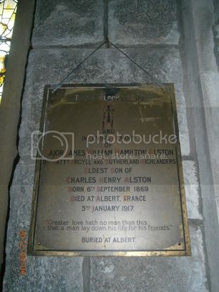 TO THE GLORY OF GOD/AND/IN LOVING MEMORY/OF/MAJOR JAMES WILLIAM HAMILTON ALSTON/11TH BATTN ARGYLL AND SUTHERLAND HIGHLANDERS/ELDEST SON OF/CHARLES HENRY ALSTON/BORN 6TH SEPTEMBER 1869/DIED AT ALBERT, FRANCE/3RD JANUARY 1917/"Greater love hath no man than this/that a man lay down his life for his friends."/BURIED AT ALBERT