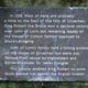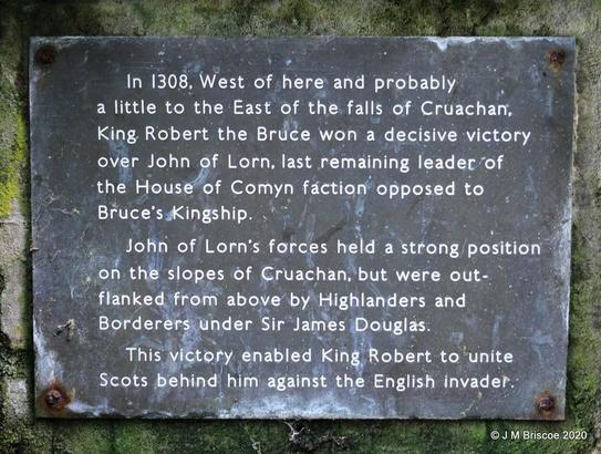 In 1308, West of here and probably / a little to the East of the falls of Cruachan, / King Robert the Bruce won a decisive victory / over John of Lorn, last remaining leader of / the House of Comyn faction opposed to / Bruce's Kingship. / John of Lorn's forces had a strong position / on the slopes of Cruachan, but were out- / flanked from above Highlanders and / Borderers under Sir James Douglas. / Their victory enabled King Robert to unite the / Scots behind him against the English invader.