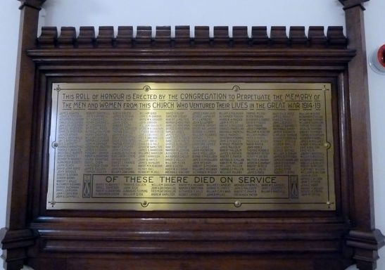 THIS ROLL OF HONOUR IS ERECTED BY THE CONGREGATION TO PERPEPETUATE THE MEMORY OF THE MEN AND WOMEN FROM THIS CHURCH WHO VENTURED THEIR LIVES IN THE GREAT WAR 1914 – 1919/[names in 10 columns]/ [in a box at the bottom of the plaque]-OF THESE THERE DIED ON SERVICE/[names in 7 columns]