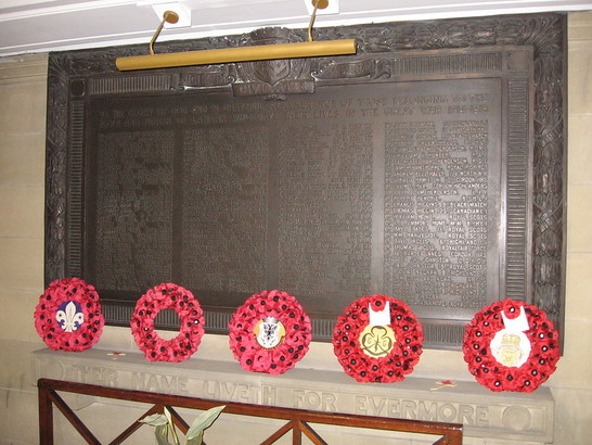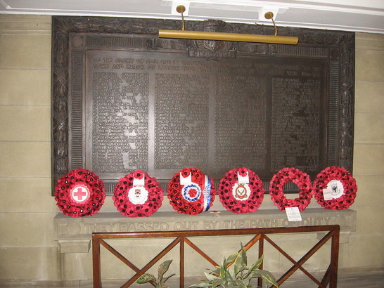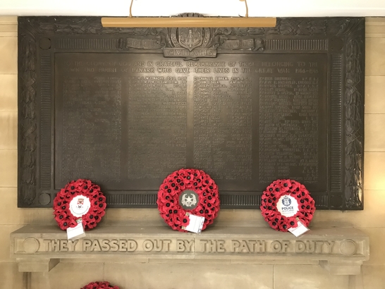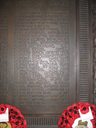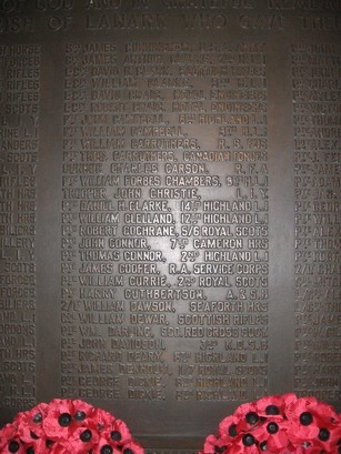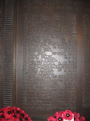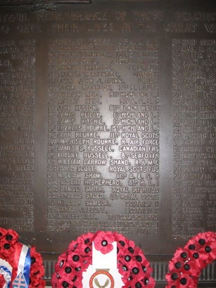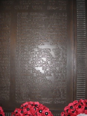 1st WW1 plaque- THEIR NAME LIVETH FOR EVER MORE/TO THE GLORY OF GOD AND IN GRATEFUL REMEMBRANCE OF THOSE BELONGING TO THE/TOWN AND PARISH OF LANARK WHO GAVE THEIR LIVES IN THE GREAT WAR 1914 - 1918/[names A-K in 4 columns] 2nd WW1 plaque THEY PASSED OUT BY THE PATH OF DUTY//TO THE GLORY OF GOD AND IN GRATEFUL REMEMBRANCE OF THOSE BELONGING TO THE/TOWN AND PARISH OF LANARK WHO GAVE THEIR LIVES IN THE GREAT WAR 1914 - 1918/[names L-Y in 4 columns]