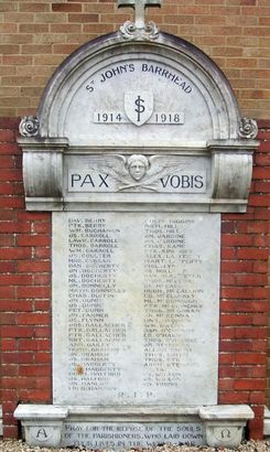ST JOHN'S BARRHEAD/1914 1918/PAX VOBIS/[names in 2 columns]/R.I.P./PRAY FOR THE REPOSE OF THE SOULS/OF THE PARISHIONERS, WHO LAID DOWN/THEIR LIVES IN THE WORLD WAR
