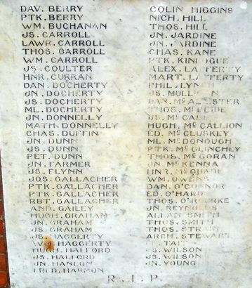 Columm 1- Dav. Berry/ Ptk. Berry/ Wm. Buchanan/ Js. Carroll/ Lawr. Carroll/ Thos. Carroll/ Wm. Carroll/ Js. Coulter/ Hnr. Curran/ Dan. Docherty/ Jn. Docherty/ Js. Docherty/ Ml. Docherty/ Jn. Donnelly/ Math. Donnelly/ Chas. Duffin/ Jn. Dunn/ Js. Dunn/ Pet. Dunn/ Jn. Farmer/ Js. Flynn/ Jos. Gallacher/ Ptk. Gallacher/ Ptk. Gallacher/ Rbt. Gallacher/ And. Gailey/ Hugh Graham/ Jn. Graham/ Js. Graham/ Js. Haggerty/ Wm. Haggerty/ Hugh Halford/ Js. Halford/ Jn. Hanlon/ Fred. Harmon/ Column 2- Colin Higgins/ Nich. Hill/ Thos. Hill/ Jn. Jardine/ Jn. Jardine/ Chas. Kane/ Ptk. Kinlogue/ Alex. Lafferty/ Mart. Lafferty/ Phil Lynch/ Js. Mulligan/ Dan. McAllister/ Thos. McBride/ Js. McCabe/ Hugh McCallion/ Ed. McCluskey/ Ml. McDonough/ Ptk. McGlichey/ Thos. McGoran/ Jn. McKenna/ Hnr. McQuade/ Wm. Owens/ Dan. O’Connor/ Ed. O’Hard/ Thos. O’Rourke/ Jn. Reynolds/ Allan Smith/ Thos. Smith/ Thos. Strain/ Arch. Stewart/ Fr. Tait/ Js. Wilson/ Js. Wilson/ Jn. Young/