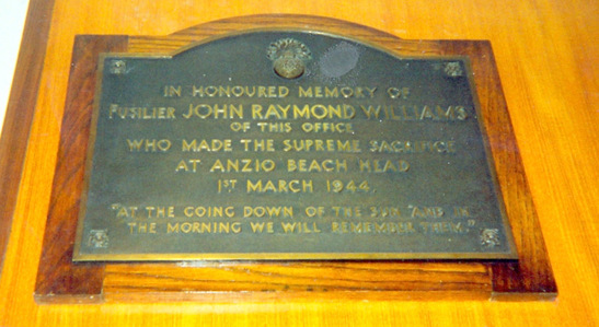 HONI SOIT QUI MAL Y PENSE/ IN HONOURED MEMORY OF/ FUSILER JOHN RAYMOND WILLIAMS/ OF THIS OFFICE/ WHO MADE THE SUPREME SACRIFICE/ AT ANZIO BEACH HEAD/ 1ST MARCH 1944/ "AT THE GOING DOWN OF THE SUN AND IN/ THE MORNING WE WILL REMEMBER THEM"