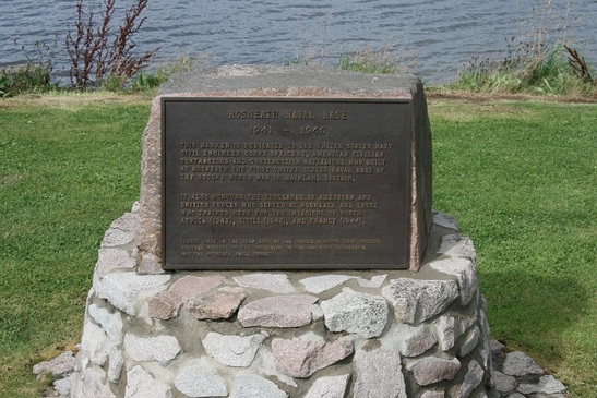 ROSNEATH NAVAL BASE/ 1941 - 1945/ THIS MARKER IS DEDICATED TO THE UNITED STATES NAVY CIVIL ENGINEER CORPS/ OFFICERS, AMERICAN CIVILIAN CONTRACTORS AND CONSTRUCTION BATTALIONS/ WHO BUILT AT ROSNEATH THE FIRST UNITED STATES NAVAL BASE OF WORLD WAR/ TWO IN MAINLAND BRITAIN/ IT ALSO HONOURS THE THOUSANDS OF AMERICAN AND BRITISH FORCES WHO/ SERVED AT ROSNEATH AND THOSE WHO TRAINED AT ROSNEATH AND THOSE WHO TRAINED HERE FOR THE INVASIONS OF/ NORTH AFRICA (1942), SICILY (1943) AND FRANCE (1944) PLACED HERE IN THE YEAR 200 BY THE UNITED KINGDOM STATE SOCIETY,/ NATIONAL SOCIETY OF THE DAUGHTERS OF THE AMERICAN REVOLUTION,/ AND THE ROSNEATH ANVIL TRUST.