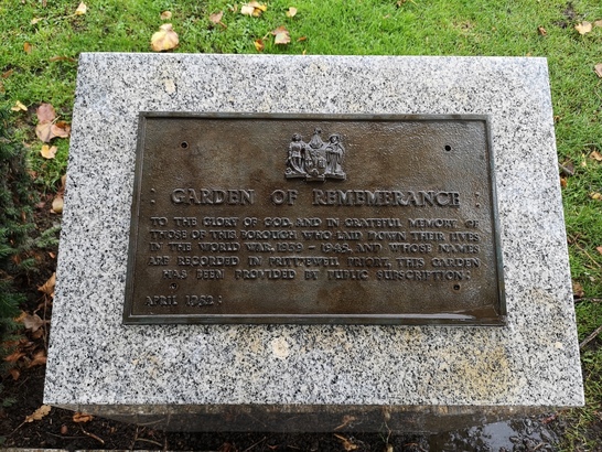 GARDEN OF REMEMBRANCE TO THE GLORY OF GOD, AND IN GRATEFUL MEMORY OF THOSE OF THIS BOROUGH WHO LAID DOWN THEIR LIVES IN THE WORLD WAR 1939 - 1945, AND WHOSE NAMES ARE RECORDED IN PRITTLEWELL PRIORY, THIS GARDEN HAS BEEN PROVIDED BY PUBLIC SUBSCRIPTION APRIL 1952