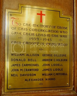 TO THE MEMORY OF THOSE/OF THIS CONGREGATION WHO/GAVE THEIR LIVES IN THE WAR/1939-1945/THIS CANOPY IS DEDICATED/[names in 2 columns]