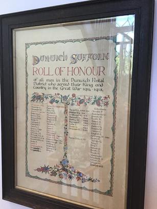 DUNWICH SUFFOLK/ ROLL OF HONOUR/ of all men in the Dunwich Postal/ District who served their King and/ Country in the Great War 1914-1918./ (76 Names of whom 11 fell)