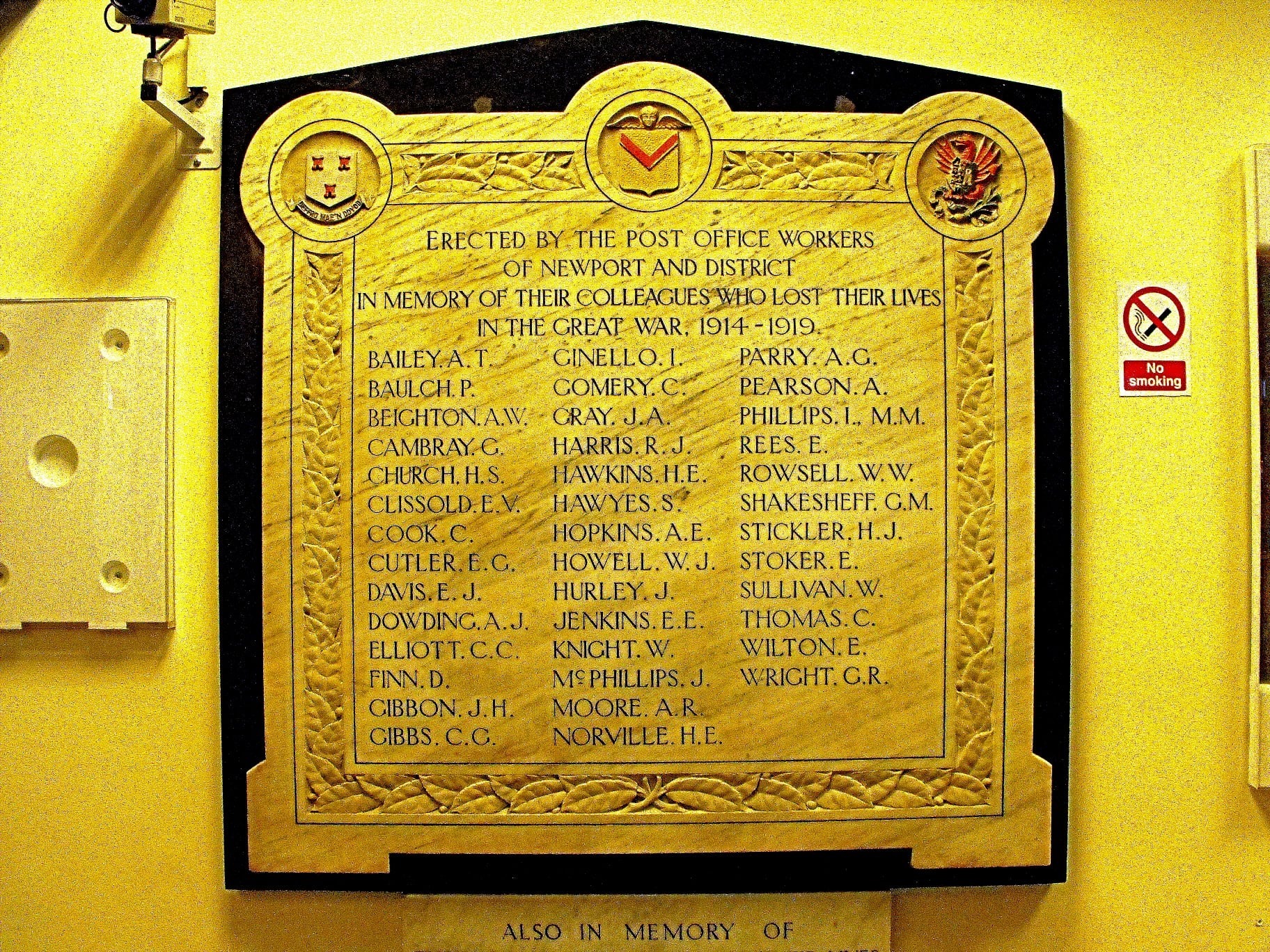 This is a transcription of the Newport GPO (General Post Office) Great War Memorial shown in the image. Newport Post Office War Memorial ERECTED BY THE POST OFFICE WORKERS OF NEWPORT AND DISTRICT IN MEMORY OF THEIR COLLEAGUES WHO LOST THEIR LIVES IN THE GREAT WAR, 1914 - 1919. Roll of Honour Column 1 Column 2 Column 3 BAILEY. A. T. GINELLO. I. PARRY. A. G. BAULCH. P. GOMERY. C. PEARSON. A. BEIGHTON. A. W. GRAY. J. A. PHILLIPS. I., M.M. CAMBRAY. G. HARRIS. R. J. REES. E. CHURCH. H. S. HAWKINS. H. E. ROWSELL. W. W. CLISSOLD. E. V. HAWYES. S. SHAKESHEFF. G. M. COOK. C. HOPKINS. A. E. STICKLER. H. J. CUTLER. E. C. HOWELL. W. J. STOKER. E. DAVIS. E. J. HURLEY. J. SULLIVAN. W. DOWDING. A. J. JENKINS. E. E. THOMAS. C. ELLIOTT. C. C. KNIGHT. W. WILTON. E. FINN. D. McPHILLIPS. J. WRIGHT. G. R. GIBBON. J. H. MOORE. A. R. GIBBS. C. G. NORVILLE. H. E.