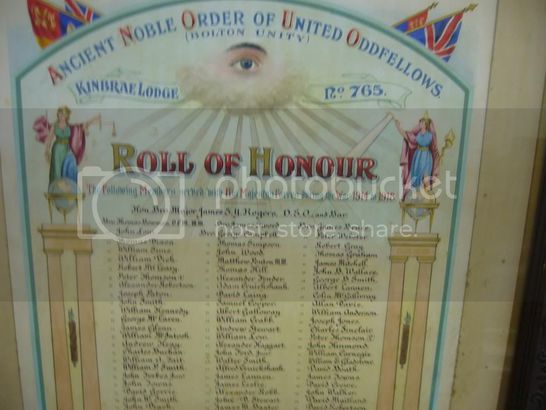 ANCIENT NOBLE ORDER OF UNITED ODDFELLOWS/(BOLTON UNITY)/KINBRAE LODGE NO. 765/ROLL OF HONOUR/The Following Members served with His Majesty's Forces during the War 1914 to 1918/MILITARY HONOURS/[83 names]/KILLED IN ACTION/[10 names]/Their names shall live for evermore