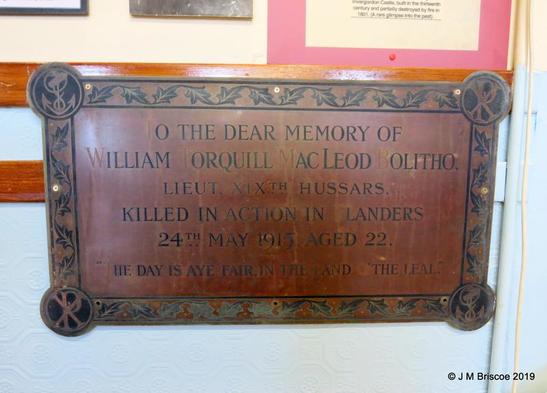 TO THE DEAR MEMORY OF / WILLIAM TORQUIL MACLEOD BOLITHO / LIEUT. XIXTH HUSSARS / KILLED IN ACTION IN FLANDERS / 24TH MAY 1915, AGED 22. / "THE DAY IS AYE FAIR, IN THE LAND O' THE LEAL."